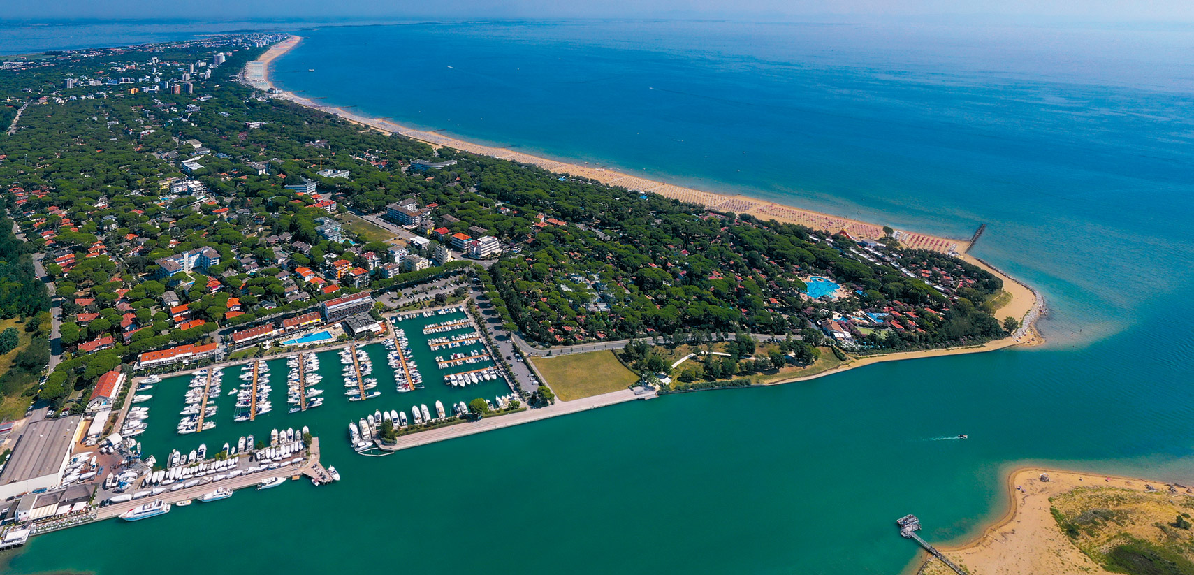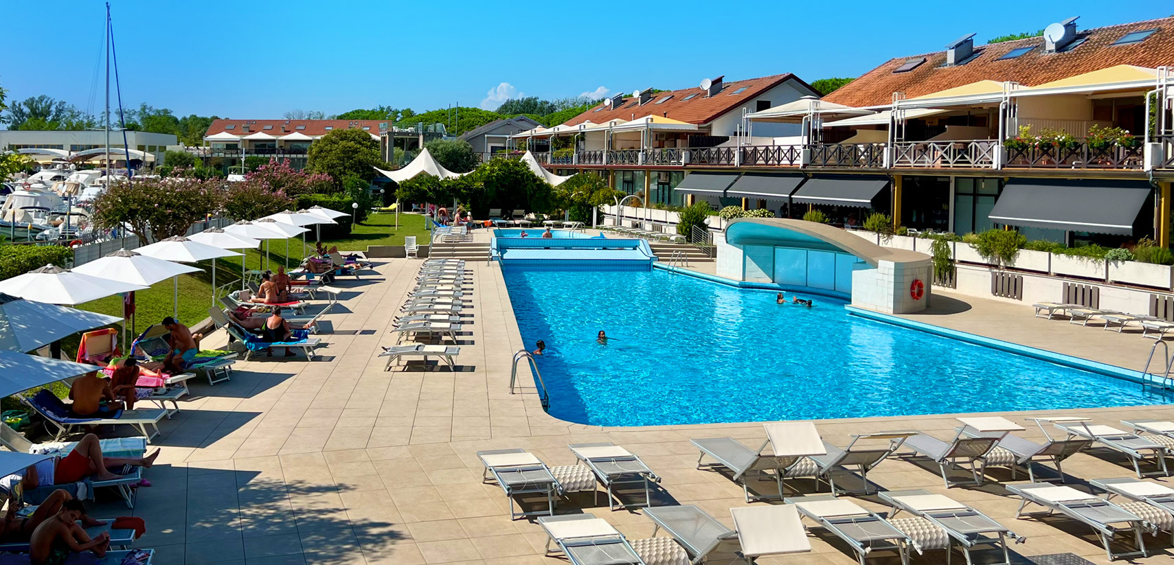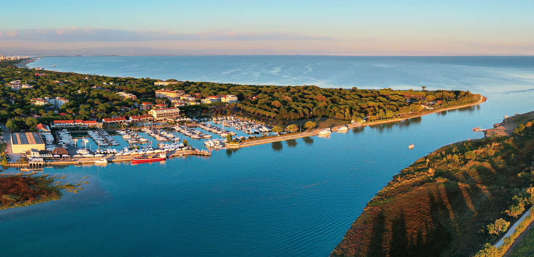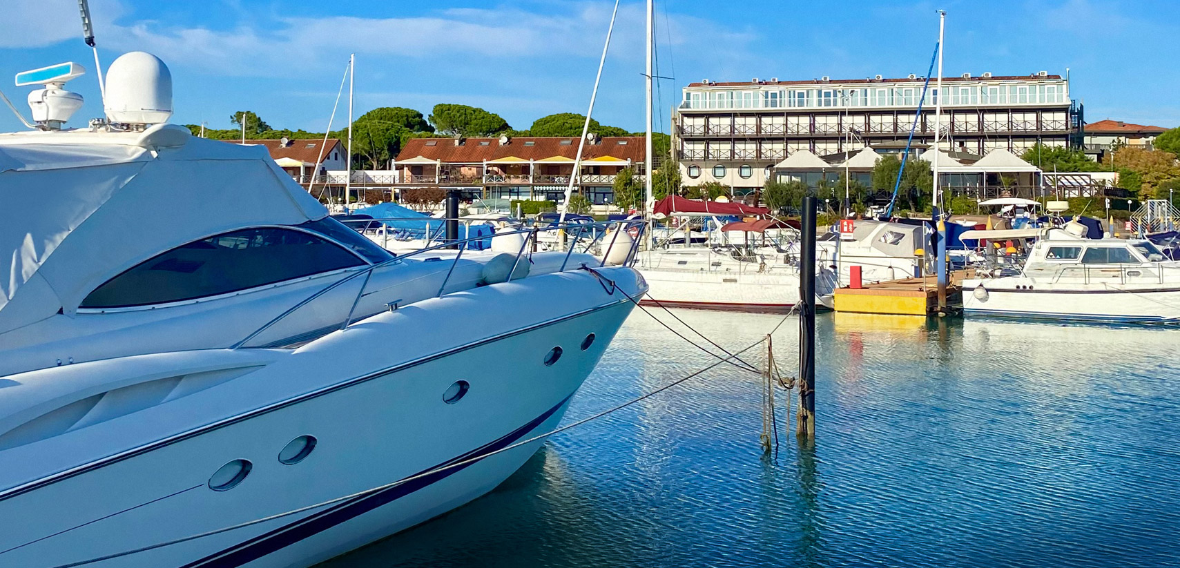 Großzügige und helle Zimmer und Suiten mit komfortabler Einrichtung, die durch ein helles und freundliches Design mit natürlichen Materialien wie Holz und Schilf besticht und durch zahlreiche Annehmlichkeiten ergänzt wird. Apartments mit direktem Blick auf den Yachthafen und die Mündung des Flusses Tagliamento. Hausboote für einen einzigartigen Aufenthalt. Gästen stehen ein großes Restaurant mit Blick auf den Anleger, ein olympisches Schwimmbecken mit angrenzendem Kinderbecken, eine Sauna und ein türkisches Bad zur Verfügung